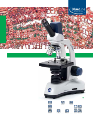 Kính hiển vi một mắt được trang bị thị kính WF 10x / 18mm, đầu mũi chụp xoay bốn hướng, vật kính tiêu sắc, bàn sa trượt 123 x 119 mm với hai kẹp định hướng, tụ quang Abbe và đèn chiếu sáng LED 1 W tích hợp với nguồn điện trong 100 - 240 V. Kính hiển vi EcoBlue có thể tùy chọn được trang bị bàn sa trượt cơ hướng di trục X-Y 50 x 30 mm
