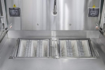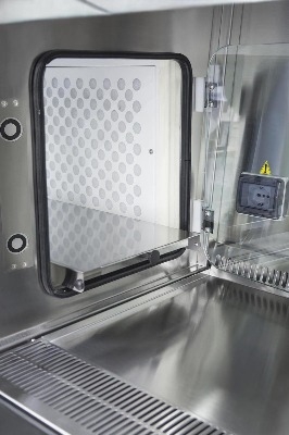- Không khí được điều áp được đẩy vào khoang và sau đó đi xuống buồng làm việc trong điều kiện dòng chảy tầng nhờ vào bộ lọc HEPA H14 trên buồng làm việc để bảo vệ các sản phẩm được xử lý và tránh nhiễm bẩn chéo. Toàn bộ lượng không khí vô trùng được đẩy qua các khe trước và sau của bề mặt bàn làm việc vào bộ lọc chính H14 HEPA nằm bên dưới bề mặt làm việc và sau đó được tuần hoàn lại từ kênh ống nằm ở vách phía sau nơi nó được trộn với không khí đến từ 2 cửa chuyển.